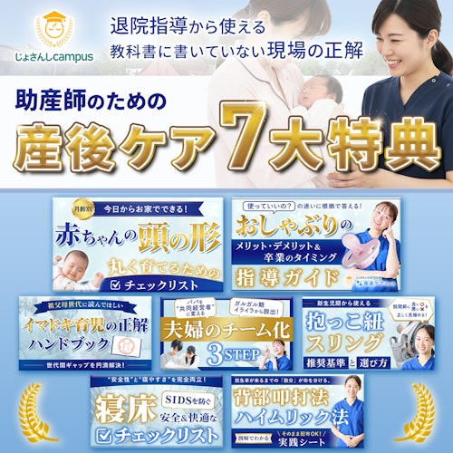 今回、無料体験会にご参加いただいた方には、現場でよく聞かれる質問に自信を持って答えられるようになる「退院指導から活かせる 助産師のための産後ケア7大特典」をプレゼントします。