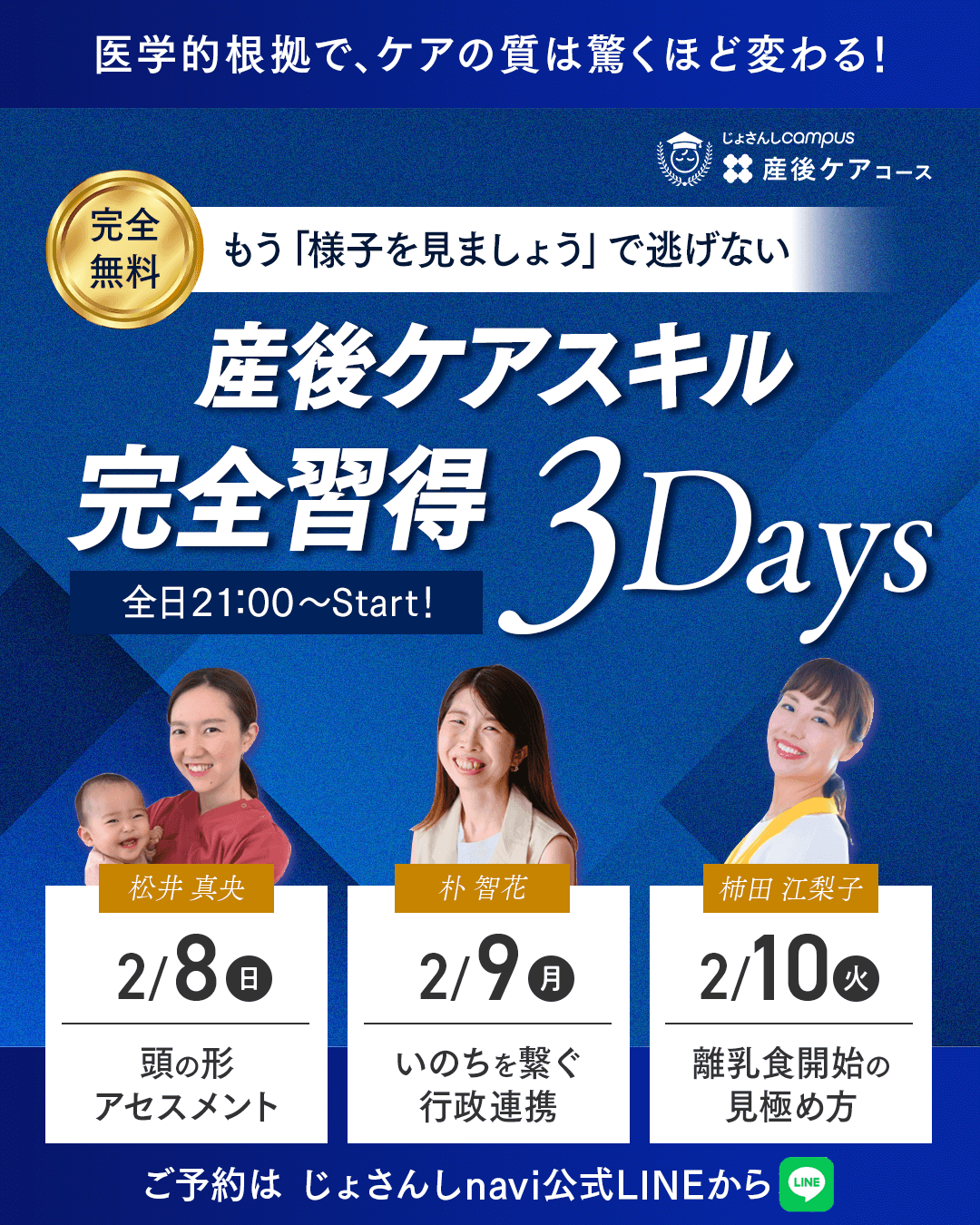 じょさんしcampusでは、医学的根拠に基づいた産後ケアスキルを学べる産後ケアコース 無料体験会を開催します。1回だけのご参加も、3回全ての参加も大歓迎です。